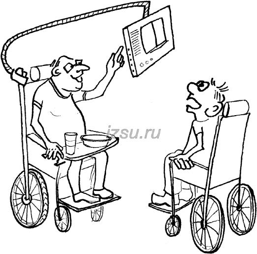 В сильно цивилизованных странах уже есть коляски для дома, с электроприводом, для здоровых людей. Чтобы по дому не ходить. Сидишь себе в этой коляске, кнопки нажимаешь и передвигаешься. Подъехал к холодильнику – взял еды, переехал к микроволновой печи – еду подогрел, поехал к телевизору. Перед телевизором поел и заснул. Вот это жизнь! Еще бы горшок под нее, под колясочку, чтоб не отрываться от процесса. Представляете, даже мебель не нужна. Какая экономия! Из мебели – коляска, телевизор и холодильник. А для строителей как удобно! Нужна одна маленькая комната, чтобы в нее поместилась коляска с холодильником, телевизором и микроволной печью. Здорово! Минимум затрат, максимум дохода!