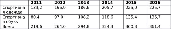 Таблица 1.1 Объем продаж спортивной одежды и обуви в России (млрд. руб.)8