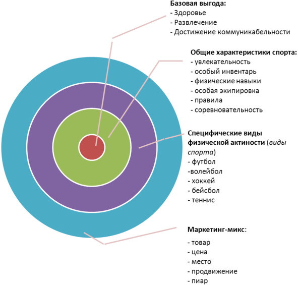 Сердцевина спортивного продукта – базовые выгоды спорта (здоровье, развлечение и общение). Конечно, в данном случае они представлены в самом общем виде, на практике у каждого конкретного спортивного продукта и каждой целевой группы клиентов будут свои, более специфические базовые выгоды. Тем не менее, именно эта триада создает основу для них для всех.
