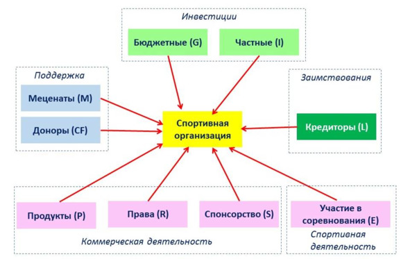 Российская нормативно-правовая база регулирует отношения хозяйствующих субъектов в спорте, отдельно определяя в качестве основных источников доходов некоммерческих физкультурно-спортивных организаций регулярные и единовременные поступления от учредителей (участников, членов); добровольные имущественные взносы и пожертвования; выручка от реализации товаров, работ, услуг; дивиденды (доходы, проценты), получаемые по акциям, облигациям, другим ценным бумагам и вкладам; доходы, получаемые от собственности некоммерческой организации; другие не запрещенные законом поступления27.