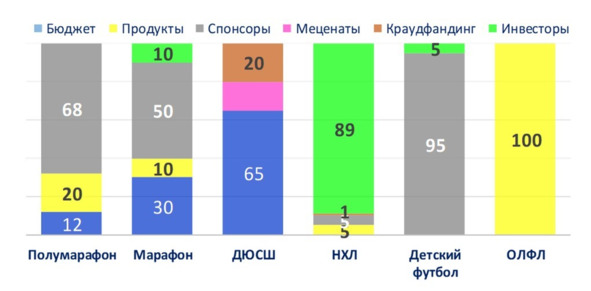 Пятую часть бюджета соревнований в ДЮСШ небольшого российского города составляют добровольные взносы родителей (краудфандниг), а в структуре доходов детского футбольного турнира международного масштаба львиная доля приходится на спонсорские вложения. Матчи Ночной хоккейной лиги (НХЛ) проводятся в основном на средства владельцев клуба, а турнир одной из любительских футбольных лиг (ОЛФЛ) полностью финансируется за счет самих участников (продукты).