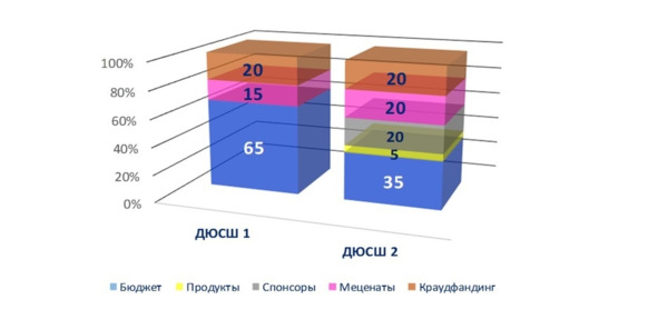 Рис. 3.5. Существующая (ДЮСШ-1) и желаемая (ДЮСШ-2) структуры доходов соревнований в детской спортивной школе