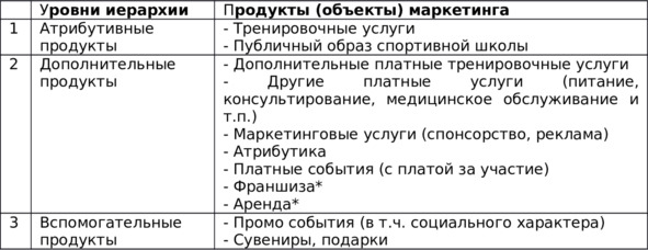 Есть еще и третий уровень иерархии – к нему следует отнести вспомогательные продукты, с помощью которых спортивная школа может продвигать свои атрибутивные и вспомогательные продукты.