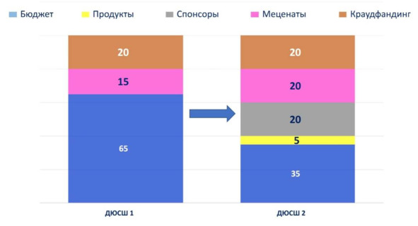 На рисунке 5.2 приведен пример работы с видением событийного продукта ДЮСШ – открытых соревнований городского масштаба. В настоящее время структура финансирования включает три источника доходов – средства, выделяемые из бюджета, краудфандинг и безвозмездная помощь меценатов (ДЮСШ-1). В стремлении улучшить качество события, менеджмент разрабатывает его новое видение, идея которого – расширение программы соревнований за счет включения новой категории участников – взрослых спортсменов-любителей.