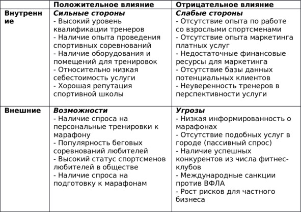 Подчеркнем, что оценку возможностей, как совокупность факторов внешней среды, способствующих благоприятному развитию продукта или самой спортивной школы, нельзя путать с будущими возможными решениями. Иными словами, в SWOT-анализе нельзя отнести к категории «возможности» решение менеджмента сформировать базу данных потенциальных клиентов в ответ на ее отсутствие. Сюда следует отнести позитивные для спортшколы характеристики, объективно складывающиеся во внешней среде.