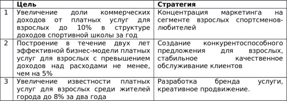 Таблица 5.4 Соотношение маркетинговых целей и стратегий в отношении продукта спортивной школы