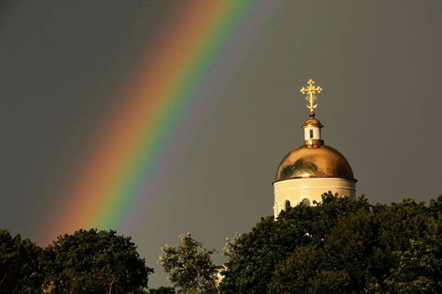 Неспешно как-то, словно бы по мановению чьей-то волшебной руки, на небе установилась, даже без капельки дождя, прекрасная радуга, таинственно отразившаяся в зеркальных водах матушки Сухоны-реки.