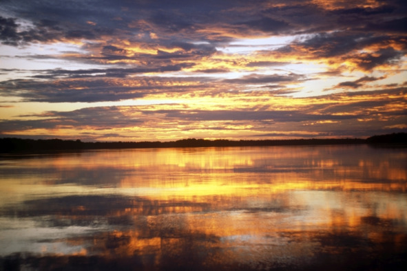 Окружающий пейзаж по-прежнему одновременно потрясающий и однообразный – вода и джунгли, джунгли и вода. Великая река, подпитываемая постоянно идущими дождями, затопила лес – прибрежные деревья стоят в воде, и от этого кажется, что граница между небом и водой размыта.