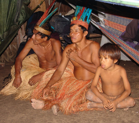 Вечером несколько мужчин и женщин, одетых в пышные юбки из волокон пальмы, приходят в малоку и рассаживаются на земле в центре жилища.
