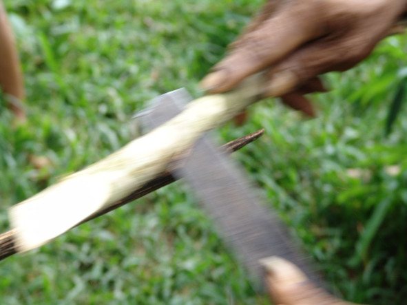 Ауа, также являющийся одним из старейших мужчин Бамено и братом Кемпери, делает для себя новое копье из твердой, как железо, древесины персиковой пальмы. Предварительно обработанную заготовку он выпрямляет над пышущими жаром углями костра. Потом он выносит ее из хижины и, укрепив между двух стволов, начинает обрабатывать, придавая ей нужную форму при помощи куска острого мачете, зажатого в расщепленном куске дерева.
