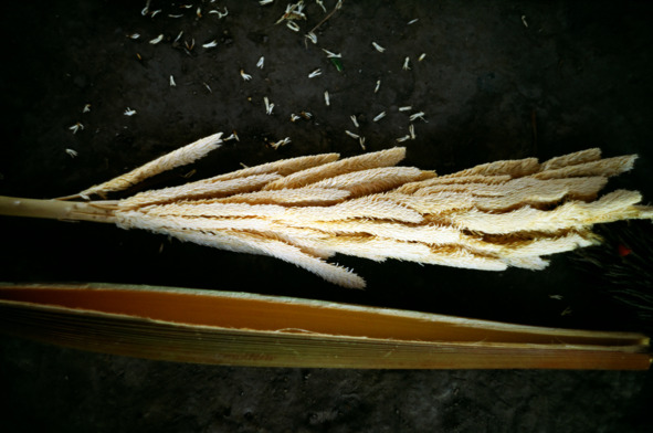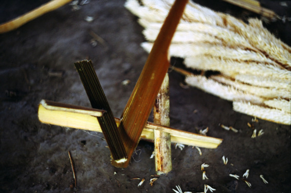Один из мальчишек приносит из леса странный плод продолговатой формы. Говорит, что это некая курвата. С очень серьезным видом он начинает что-то мастерить из курваты, ловко орудуя ножом. Я наблюдаю за ним. Он разламывает плотную кожуру ножом – внутри большая мохнатая белая метелка. Выкидывая за ненадобностью метелку, он продолжает деловито расщеплять и резать плотную оболочку курваты. Сделав таким образом несколько продолговатых заготовок, соединяет их между собой в какой-то только ему понятной последовательности. В итоге получается своеобразная крестообразная штуковина, напоминающая не то самолет, не то какой-то замысловатый каркас. Паренек критически осматривает получившееся изделие.