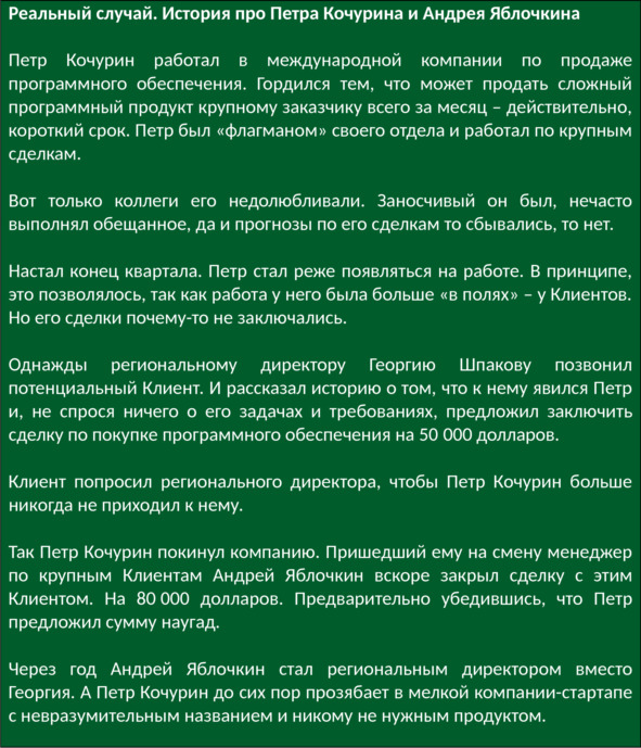 Многие, прочитав эти строки, мысленно скажут мне: «Но ведь Вы же согласны, это же действительно так!» Я не могу не согласиться, что людей, которые идут в продажи с такими посылами, очень много. И в то же время точно знаю, что остаются в ней и достигают мастерства люди с совсем другой мотивацией. О том, что это за мотивация, поговорим чуть позже.