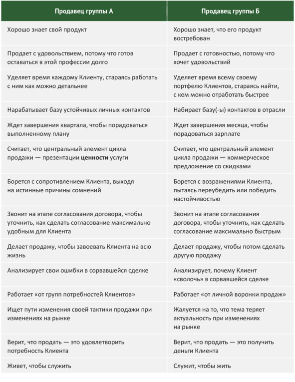 Повторю, продавцы группы А и продавцы группы Б чаще всего сосуществуют в одной организации. Нередко их сложно отличить одного от другого внешне, по словам и даже по отдельным действиям, но важная разница при этом все равно остается: как в той притче – один из них кладет кирпич, а другой – строит храм.