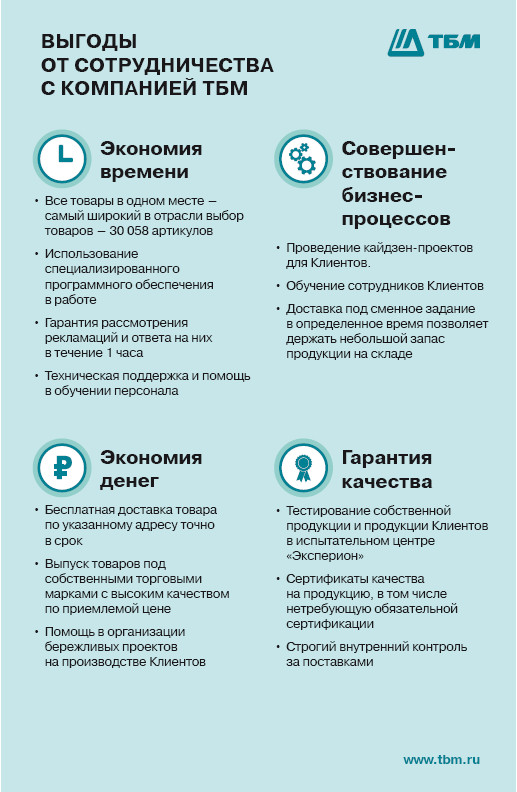 Одной из основных стратегических целей ТБМ является цель: «Быть лучшим поставщиком для наших Клиентов», – поэтому мы стремимся не просто поставлять товар, но и создавать дополнительную ценность для Клиентов. Для этого Компания ТБМ постоянно совершенствует свои бизнес-процессы, повышает качество продуктов и услуг, разрабатывает новые сервисы, оказывает консультационную поддержку. Сейчас мы также хотели бы немного помочь нашим Клиентам, поделившись знаниями в области маркетинга и продвижения товаров. Мы надеемся, что информация, изложенная в данной книге, принесет пользу и поспособствует росту ваших продаж!