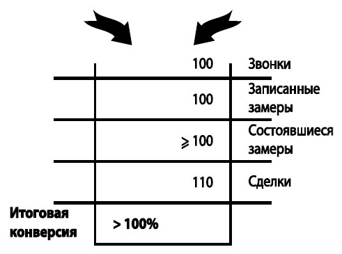 В этот же показатель будут входить сделки, которые клиенты будут заключать в офисе уже после визита замерщика (сделки по кредиту или сделки с недоверчивыми клиентами, которые хотят убедиться в существовании вашего офиса, и т. д.).