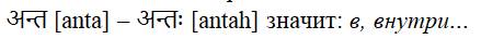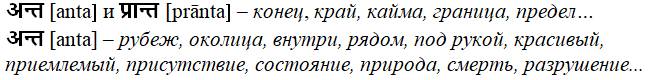 Но при этом заметим осторожно. Связь с индоевропейским корнем an прослеживается не только формальная, но и смысловая: сравним др.-инд. antas «конец», antyas «конечный». В священных текстах вед мы находим [anta] и [prānta], с лексическими значениями: конец, край, кайма, граница, предел и т. д. Улыбнёмся тут, заметив поправку: начало есть почин, а не конец. Оба корневых смысла выражают переход из одного состояния в другое. Некое состояние пограничья… Прямые переводные параллели [anta] с санскрита на русский: рубеж, околица, внутри, рядом, под рукой, красивый, приемлемый, присутствие, состояние, природа, смерть, разрушение…