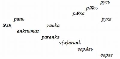 И в том несказанно повезло истории нашей «руси», а при рождении и «варягов» её составляющих, что в связи с материнским словом «рука» мы можем определить стволовые ветви целого родословного древа и очертить семейный круг слов и понятий. Установив ближайший круг родственников слова «русь» в семье индоевропейских языков, мы можем докопаться даже до корней едва не трёх десятков тысяч лет древности, ибо слово «рука» старше самой индоевропейской этноязыковой общности и проявляется в макросемье ностратических языков.