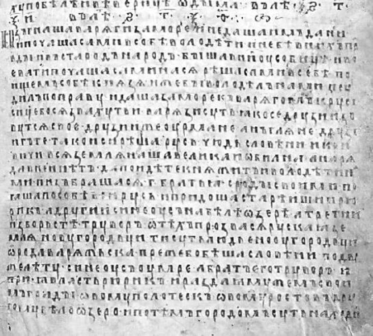 …идаша за море къ варѧгомъ к русı · сице бо сѧ звахуть и · варѧзи суть · ӕко се друзии зъвутсѧ свое · друзии же оурмане · анъглѧне друзıи гъте · тако и си рѣша· русь · чюдь словѣни· и кривичи· всѧ землѧ наша велика и ѡбилна· а нарѧда в неи нѣтъ· да поидѣте кнѧжитъ и володѣти нами… ѿ тѣхъ прозвасѧ рускаӕ землѧ…