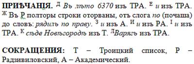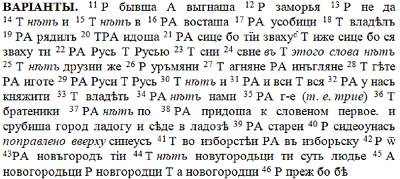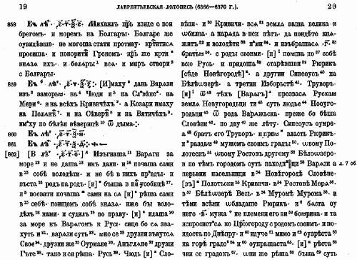 Но прежде чем приступать к русскому чтению непосредственно, ещё раз приведём здесь эту же выдержку из Лаврентьевской летописи, но уже не в оригинале, а в том академическом виде, как её истолковали издатели, – вместе с вариантами из иных списков и примечаниями. Ведь именно тексты издателей да разного рода толкователей и переписчиков (а также держим в уме переводчиков) лежат в основании наших исторических представлений и знаний – образа Руси в целом, который формирует в сознании русских людей историческая наука и школа.