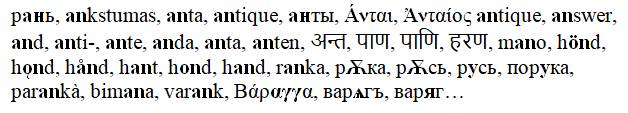 Повторюсь. Слово «рука» (как hand) в результате новейших исследований в области истории мировых языков отнесено к двум дюжинам наиболее частотных единиц речи, и история этого слова прослеживается на ряде дальнеродственных языков на глубину нескольких десятков тысяч лет72. И не мудрено, что у того, кто долго живёт – у того большая семья. В конце концов, всё человечество, согласно генетическим исследованиям, сводится к одному единственному пращуру.