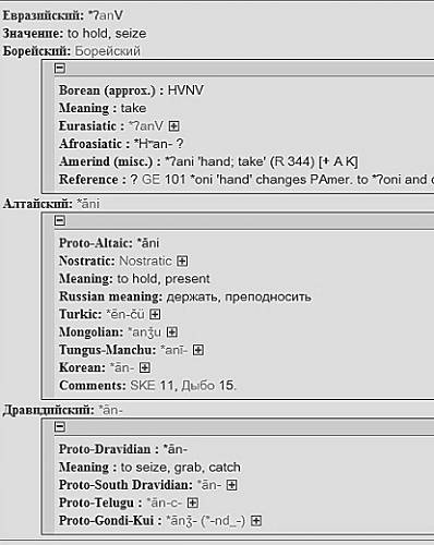 Исходя из бытующих научных гипотез, корневая глубина определятся абрисом этно-культурно-языкового единства индоевропейской расы. Увы, о далёких от нас временах 10–15 тысяч лет тому назад и много древнее, когда не зародилось ещё само индоевропейское племя, а слово hand/mano/ranka/рука (в иных, разумеется, фонетических одёжках) жило и здравствовало, история и археология молчат, а генетика и лингвистика лишь смутно намекают. Обратившись к теоретической этимологии и открыв, например, этимологическую базу Старостина, мы увидим, что корень an с общим лексическим значением «держать в руках» относится к гипотетическим Борейским языкам – макроязыковой семье более высокого уровня, нежели Ностратическая. Время существования ностратического праязыка определяется от дремучих, не поддающихся на сегодня точной датировке времён расселения человека по Евразии борейского языкового единства, и до процесса полураспада, который начался около 12 – 15 тысяч лет тому назад, в результате которого образовались отдельные языковые семьи, как-то: во-первых, индоевропейские языки (индо-ирано-греко-романо-германо-балто-славянские и др.); во-вторых, уральские (финно-угорские и самодийские), в-третьих, алтайские (тюркские, монгольские, тунгусо-маньчжурские, японо-рюкюские, корейские как изолят и др.), в-четвёртых, картвельские (грузинский, мегрельский, лазский, сванский), в-пятых, дравидийские (распространены в южн. Индии, Пакистане, южн. Афганистане, вост. Иране, на Шри Ланке, в южн. Африке, на островах Индийского и Тихого океанов, то бишь по сути языки: тамильский, телугу, каннада и малаялам), а иногда в ностратическую семью включают также афразийские и эскимосско-алеутские языки.