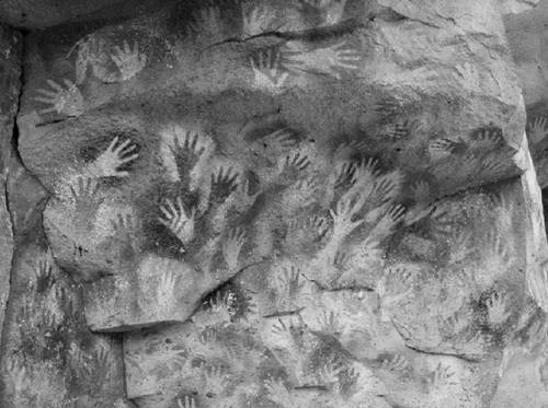Аргентина. Патагония. Долина реки Рио-Пинтурас, 160 км от города Перито Морено. Пещера Куэва-де-лас-Манос (в переводе с испанского – «Пещера рук»). «Пещера рук» была обитаема до 8 века нашей эры. Датировка, сделанная на основе анализа полых птичьих костей, посредством которых распылялся краситель, такова: возраст наиболее ранних рисунков – 10–13 тысяч лет до н.э.