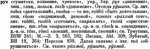 Черных в своём историко-этимологическом словаре указывает: «Рушить… – в Пов. вр. л. под 6599 г., со знач. “копать”» и «Рухнуть… В словарях – с 1794 г. …Из о.-с. *ruchnǫti. О.-с. корень *ruch-…»9. То есть время не то – лет на 800 убежало вперёд, чтобы брать в рассуждение такие языковые факты, о чём и предупреждали читателя выше.