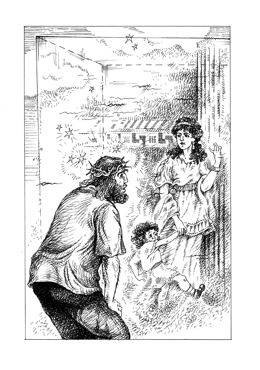 Вдыхая в картину жизнь, щеки овеял ветерок – точно такой же залетал сквозь распахнутые окна, гуляя по дому в те незапамятные дни. Забава расправил плечи и подбоченился, словно созерцал творение собственных рук. С упоением вглядываясь в детали, он забылся… и тут вздрогнул от неожиданности – в периметр вступила молодая матрона в легкой тунике, ведущая за руку упиравшегося мальчика лет трех-четырех. Зритель затаил дыхание.