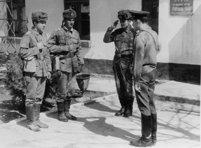 Замполит заставы «Файзабад-Кала» старший лейтенант Александр Камуля принимает доклад у пограничного наряда. 1980-е годы