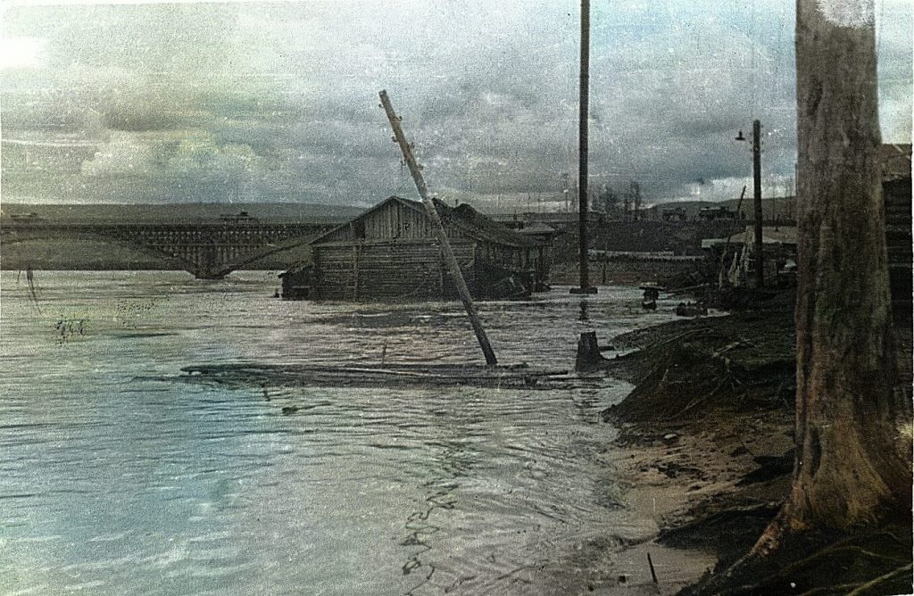 Фото №12 (архив Дорожевца А.Н.). 24 августа 1937 г. – Начало наводнения – Колыма выходит из берегов. Затоплена первая линия с домами командиров. Виден Колымский мост, на заднем плане – сопка Лысая.