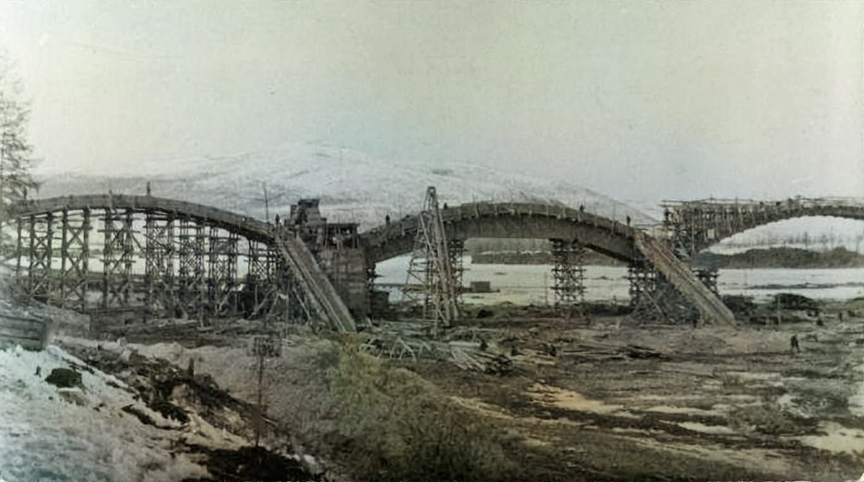 Фото №4. (архив Дорожевца А.Н.). Май 1937 г. – Мост через Колыму соединил берега реки. Арки готовы, осталось установить дорожное полотно – оно будет завершено в июне 1937 г., и первый автомобиль по мосту пересечет Колыму. На правом берегу видны многочисленные бараки – в них жили строители моста – и вольнонаёмные, и заключённые. Намного правее на берегу стояли жилые дома семей начсостава Колымского полка. Удивительно, что это фото сохранилось в чьем-то семейном архиве. За его хранение в 1938 г. и позже можно было получить срок. На празднично оформленных опорах моста висят портреты будущих "врагов народа" – слева портрет наркома НКВД Ежова, справа – директора Дальстроя Берзина.