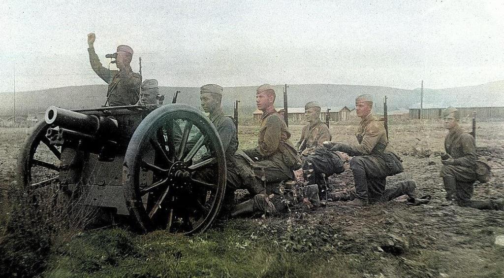 – Пулеметы системы Максима. Ими вооружены 2 пульвзвода полка. Часть пулеметов на вертлюгах, с кольцевыми прицелами – они используются как зенитные возле моста и казармы.