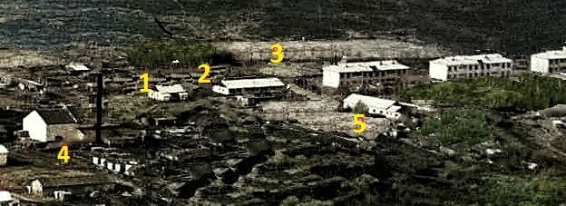 Рис. №3. Приблизительно так выглядел Дебин к середине 40-х: 1- столовая начсостава (будущая почта); 2 – детский сад (в 1949 все здание станет продуктовым магазином); 3 – стадион; 4 – котельная; 5 – начальная школа (с 1946 года жилой барак); 6 – магазин (до 1949)