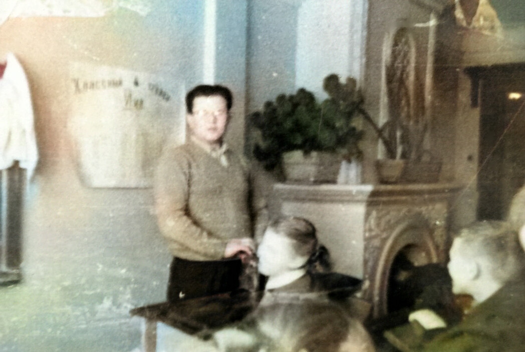 Фото №100 (архив Федорова Ю.А.). "Внутри старой школы ". – Алексей Андреевич Федоров ведет урок в классе с камином.