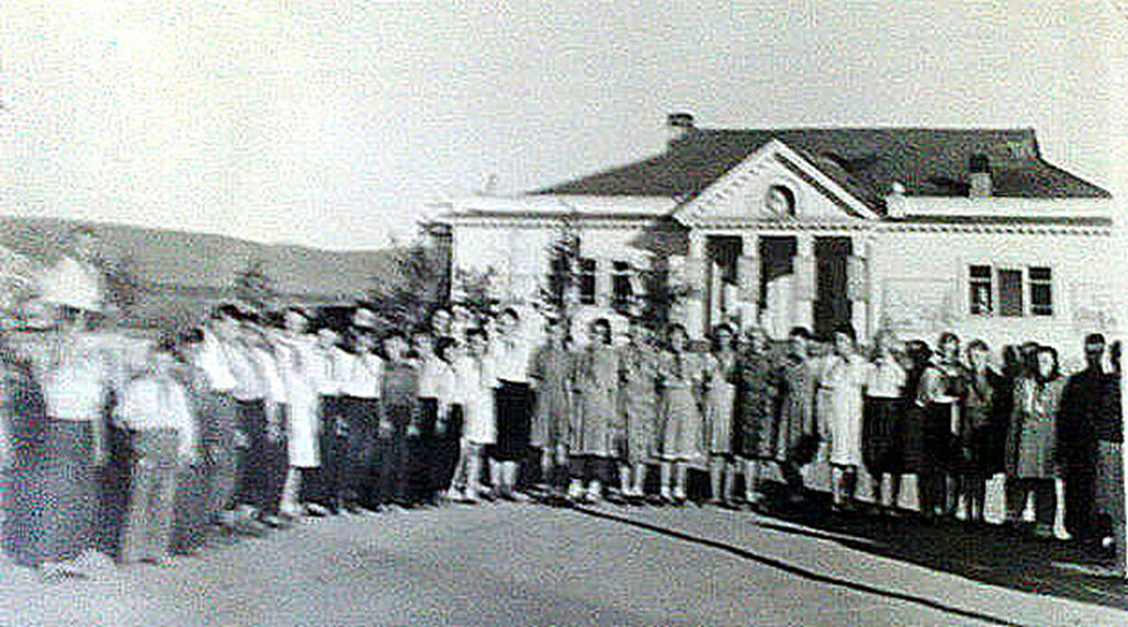 Фото №101 (архив Дорожевца А.Н.). Вероятно, лето 1954. – Учителя и школьники перед зданием школы.