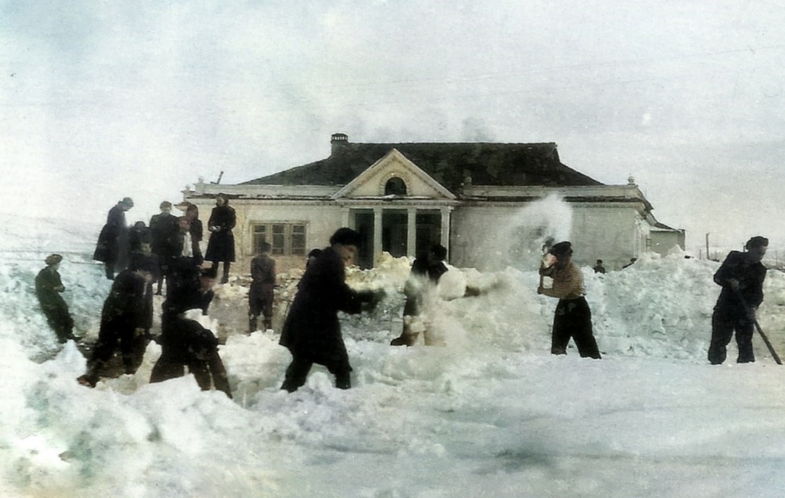 Фото №102 (архив Мицкевича И.В.). Дебин, середина 50-х. – Учителя и школьники Дебинской семилетней школы очищают школьный двор от снега.