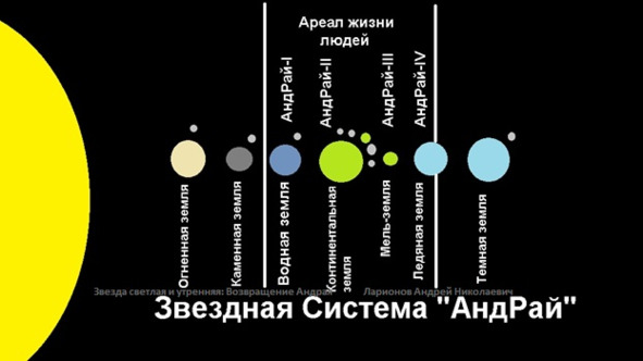 Звезда «АндРай» тяжелее Солнца примерно в 1,2 раза. В этой системе семь планет, из которых четыре пригодны для жизни людей. Наиболее благоприятные для жизни: «Континентальная земля» (АндРай-II) и «Водяная планета» (АндРай-I). Мель-земля и Ледяная земля также пригодны для жизни, хотя и условия жизни на них близки к экстремальным. На Мели-земле слишком малая гравитация, отчего люди, пребывающие там, быстро ослабевают, и не способны жить в мирах с более высокой гравитацией. Ледяная земля имеет приближенную к оптимальным для людей гравитацию, но из-за экстремальных холодов малопригодна для жизни. На стороне звезды температура там поднимается до -10..25 градусов, в темной части планеты температура опускается до -80..-110 градусов по Цельсию.