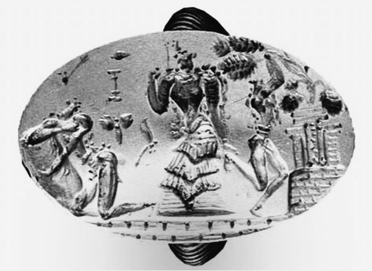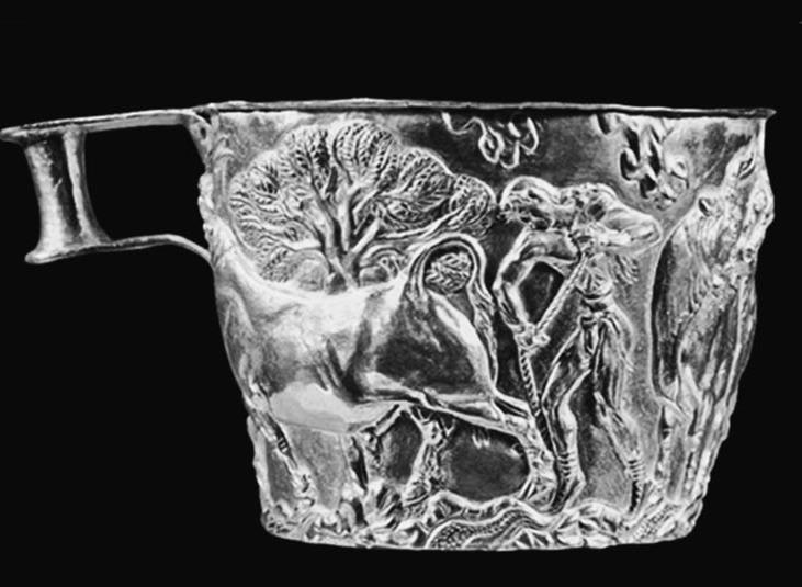 На одном из кубков быков ловят сетью, и они разбегаются в разные стороны, разбрасывая ловцов. На другом кубке быки спокойны, и один из них дает себя стреножить. Возможно, мы видим продолжение сакрального или спортивного ритуала, известного по фресковым росписям Кносса и Тиринфа. Если минойский вариант предполагал перепрыгивание через быка, то в данном случае перед нами скорее испытание несколько другого рода – бык должен быть пойман и стреножен. Отметим, что фигура мужчины, поймавшего быка, лишена какой-либо инфантильности, которую приписывают минойцам, обуславливая это матриархатом. В тех же захоронениях найдены золотые кольца, повторяющие стиль и сюжеты аналогичных колец микено-минойских находок. Здесь также нет признаков инфантильности мужских образов, но есть поклонение то ли правительнице, то ли женскому божеству.