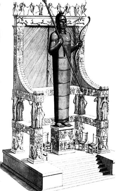 Изваяние Аполлона было огромным – высотой «верных тридцать локтей». Павсаний пишет, что оно очень древнее и «сделано безо всякого искусства». «Если не считать того, – сообщает Павсаний, – что эта статуя имеет лицо, ступни ног и кисти рук, то все остальное подобно медной (бронзовой) колонне. На голове статуи шлем, в руках – копье и лук». Нет сомнений, что это одно из древнейших изваяний, которое обычно датируют 6–7 вв. до н. э., но вполне возможно, что оно относилось к микенской эпохе. К сожалению, специалисты считают, что «Трон» создавался целиком – и само изваяние, и оформление его подножия. Это ошибка. Архаизм примитивной статуи Аполлона никак не сочетается с неологизмами собственно «трона».