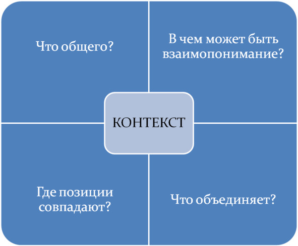 – Контекст – это нечто общее, способствующее пониманию и возможности договариваться – язык, уровень культуры, образования и т. п. переговорщиков, т.е принадлежность их к одной референтной группе. Контекст! Как его понять? И каким он бывает? Попробуйте маленький эксперимент. Найдите для ближайшего планируемого разговора несколько слов, отвечающих на все 4 вопроса. Это и станет контекстом вашего разговора.