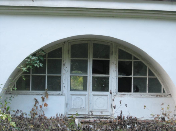 Площадка, вымощенная плиткой, начинавшаяся ещё от ворот, на этом месте обрывается (ещё одно свидетельство прерванных работ – точно так же как и со стороны садового фасада плитка не закрывает полностью даже площадку между корпусами-флигелями) и дальше начинается тропинка. Проходя по ней, мы подходим к центру фасада, долженствующему быть главным. Если бы не запустение, его можно было бы даже назвать приятным.