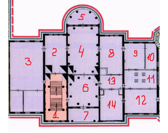 8 – библиотека, 9 – старый кабинет, 10 – угловая (образная),