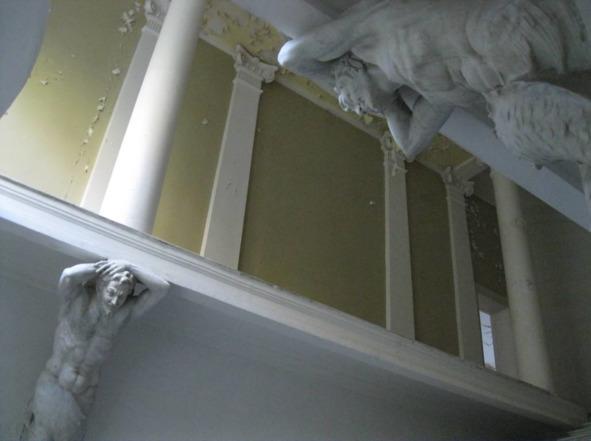 По двум её сторонам мнимый потолок поддерживают две фигуры атлантов совершенно необычного вида. В них нет муки от тяжести нависающего над ними свода, хотя вроде бы есть могучие мускулистые торсы, конечно, не такие, как, скажем, у знаменитых атлантов Эрмитажа, воспетых Александром Городницким. Эти держат «потолок» легко, даже с какой-то иронией, ехидством в лицах, усики и бородки лихо, по-мушкетерски закручены, по спинам проходят плавники, которые маскируют каркасы кронштейнов, подпирающих верхнюю площадку, а ниже пояса у них… двойные скрученные хвосты. Может быть, из-за них их еще называют тритонами. Когда-то они завершались лопастями, похожими на причудливые листья, но одна из них ныне утрачена. Они выполнены из трёх кусков мрамора и установлены при обустройстве холла уже в начале 1910-х годов, как и лестница, перевезённая сюда из городского дома Шаховских-Глебовых-Стрешневых на Большой Никитской улице (документы об этом мы уже приводили в другой главе). А над лестницей, в настоящем потолке, уже венчающем второй этаж, огромный, некогда жёлто-голубой плафон.