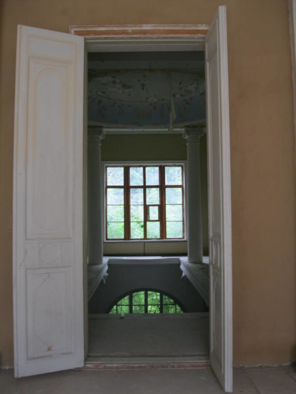 И ход действительно чёрный, в разных смыслах этого слова. Когда-то в нише была установлена дверь. Она вела в помещение под балконом, которое во времена Стрешневых было кладовой. Зайдя внутрь, человек попадал словно в подземелье, ощущение которого создают низкие своды, отсутствие освещения и набившийся внутрь грунт и мусор, под которым совершенно обескураживают превосходные полы из белого мрамора!!! С площадки у входа по обеим сторонам открываются еще два входных проёма, забранные решетками, а дальше – несколько ступенек вниз и зал с низким сводом, сейчас, после того как ниша под балконом была заколочена, очень напоминающий склеп. Здесь согласно предназначению помещения занижен даже уровень пола. Вообще, низкий первый этаж за двести с лишним лет ушел в землю, что характерно для старинных построек. Отсюда и ощущение подземелья. А между тем, мы оказываемся на оси между двумя входами, то есть, фактически, одной из доминант в планировке дворца.