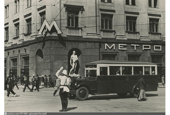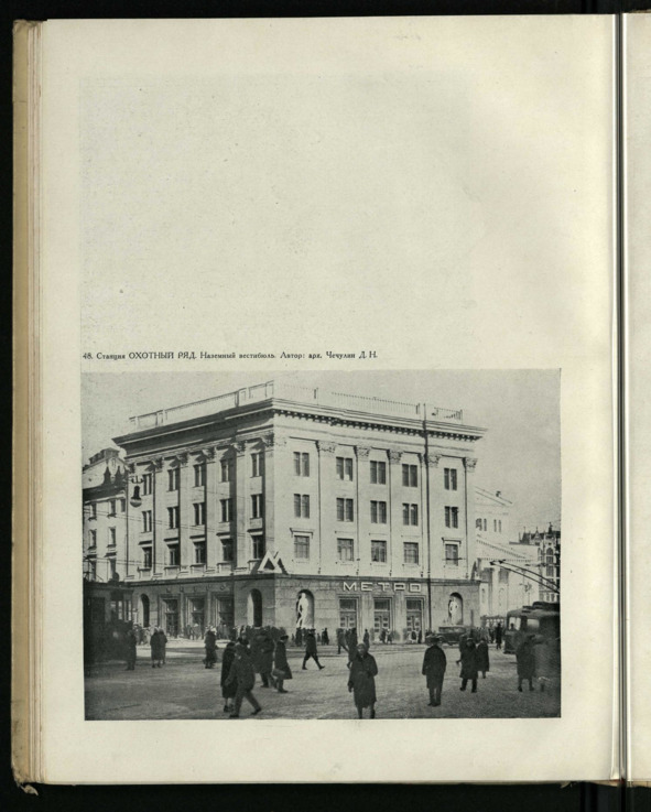 «Охотный ряд». Наземный вестибюль на углу Б. Дмитровки. Из книги «Архитектура московского метро». М., 1936
