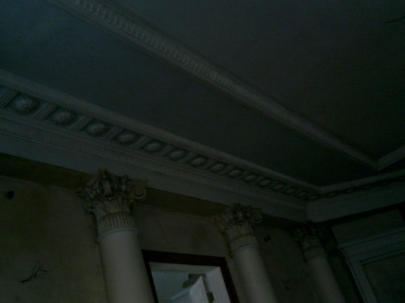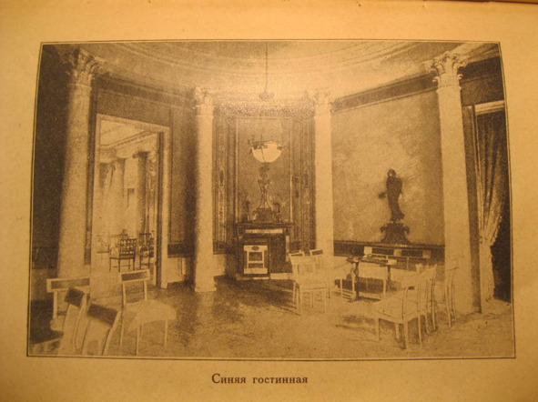 Здесь, в Голубой гостиной, опять-таки восстановлены потолки и росписи на них. Украшение потолка – дивный плафон-цветок под люстру (когда-то здесь был фонарь-чашка на цепях). Во время пожара потолок был утрачен полностью, и то, что сейчас можно видеть – настоящий подвиг реставраторов. Даже через двадцать пять лет безвременья поражает их сохранность. Уже отреставрированы колонны, а стены «забрызганы» грунтовкой и так и не дождались новой покраски. В то же время обновлены дверные проёмы и восстановлено оформление каминов (если сопоставить фотографии, представленные в работе Н.Н.Врангеля, с теперешним видом каминов, то сходство просто бросается в глаза).