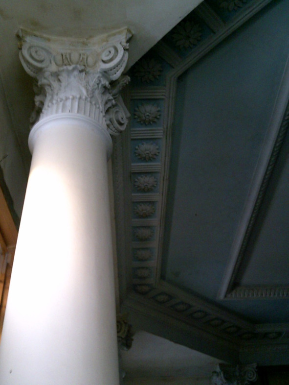 Кстати сказать, нынешний коринфский ордер колонн появился на лоджии благодаря реставраторам, в 1980-е годы. На протяжении всего XX века старые фотографии доносят до нас совершенно иной их облик, которому трудно подобрать название – капитель еще во времена Шаховской представляла собой простое цилиндрическое же утолщение собственно колонны, обрамленное по диаметру декоративными кругляшами – и только. Когда эти наслоения были сбиты, открылись основания капителей подлинных коринфских колонн, которые и были воссозданы. Фотография раскрытия остатков старых капителей попала даже в учебник по реставрации памятников архитектуры, написанный под редакцией С.С.Подъяпольского в 1988 г., и переизданный в наши дни. Они погибли в пожаре 1992 года, так что нынешние – фактически новодельные.