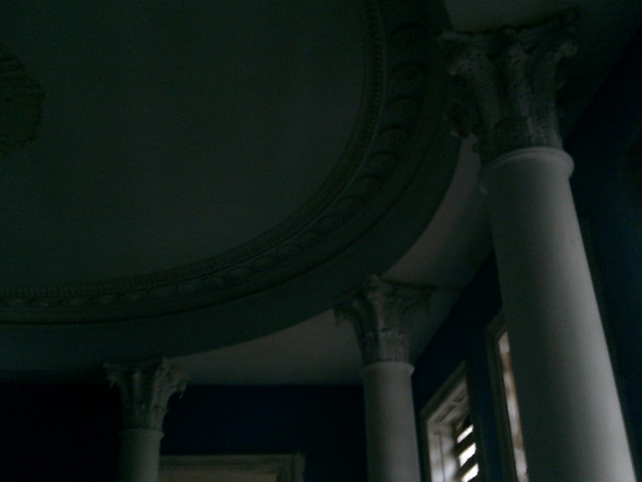 Тяжело сейчас читать в старых путеводителях про то, что этот зал производит особенно светлое впечатление, про бывшие там наборные полы… Потому что это должен был бы быть самый главный, парадный зал дворца, из которого предполагается выход в сад, на роскошный балкон. Его парадность и обилие света были подчеркнуты выдвижением при строительстве дома передней стены вперёд, с образованием светового фонаря. Кроме того, за счет этого выступа выполнены боковые двери по обеим сторонам зала, из которых лестницы по обеим сторонам парадного балкона спускались в сад, а на восходе и закате свет попадал как раз в эти двери, создавая изумительную игру света. Зал красиво обрамлен легкими колоннами, обрамляющими зал в виде вытянутого восьмиугольника.
