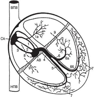 3 – задний межузловой тракт Тореля; 4 – общий ствол предсердно-желудочкового пучка (пучка Гиса); 5 – правая ножка пучка Гиса; 6 – левая ножка пучка Гиса; 6а – передневерхняя ветвь левой ножки пучка Гиса; 6б – задненижняя ветвь левой ножки пучка Гиса; 7 – субэндокардиальные волокна Пуркинье. Дополнительные (аномальные) проводящие пути: 8 – пучок Джеймса; 9 – пучки Кента