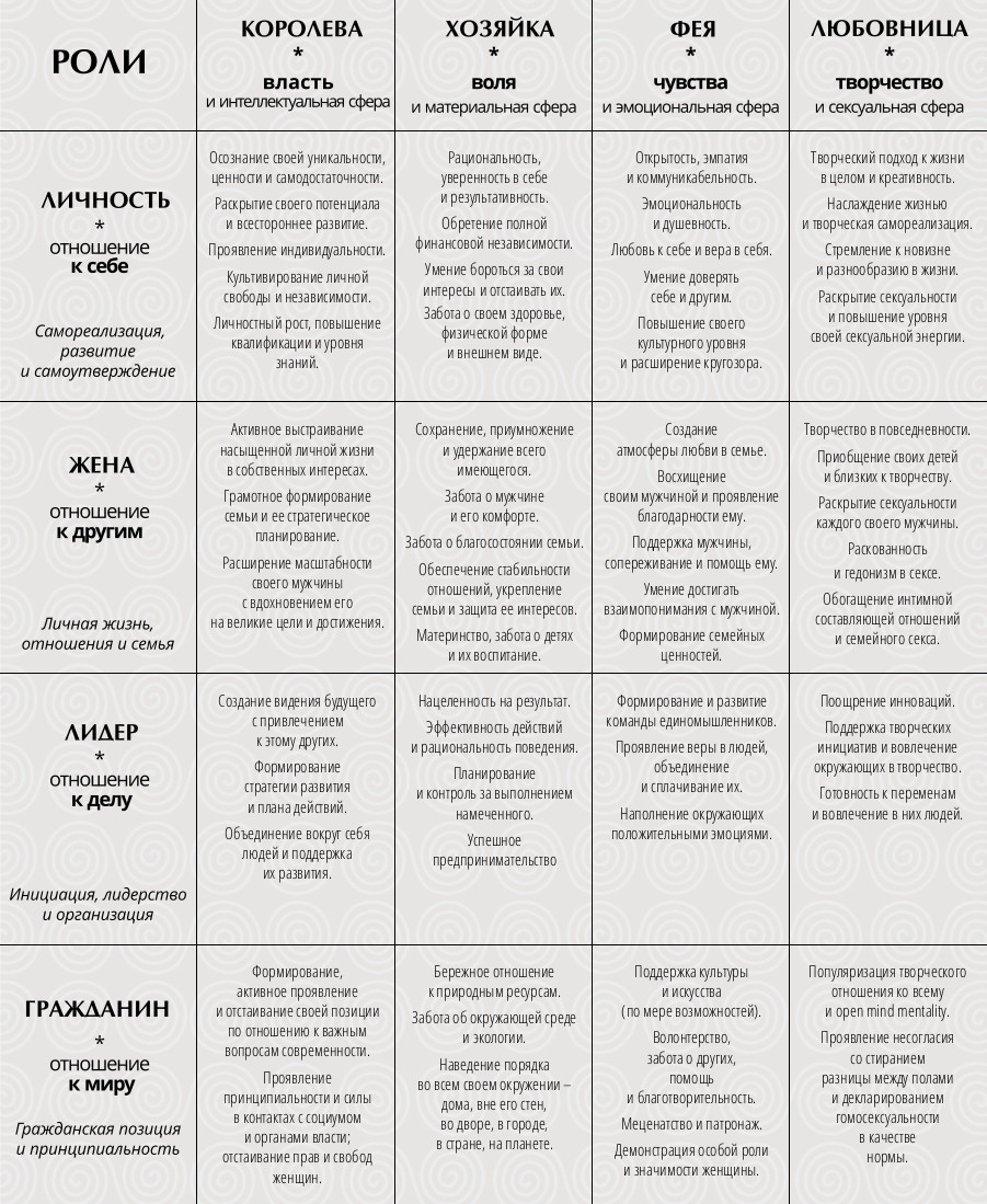 Тем самым, получается шестнадцать жизненных ролей (Королева-Личность, Королева-Жена, Королева-Лидер, Королева-Гражданин, Хозяйка-Личность и пр.), упрощенно раскрываемых следующей МАТРИЦЕЙ: